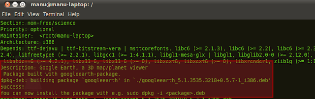 - Done. Please note that everything after " ./ " in the above command may change depending on the version of Google Earth you built using googleearth-package. So if the above command doesn't work, simply copy-paste the .deb package generated instead of what I have got here. So in generalizing the above command, it should look like this.